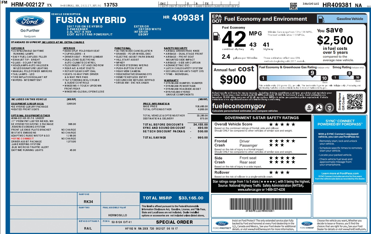 Whoa! Take a look at this feature rich gas saving 2017 Ford Fusion Hybrid SE with the hybrid luxury package. It has so many creature comforts you will swear you are driving an SEL. It seats 5 very comfortably and at 43 MPG it will save you a ton at the fuel pump.